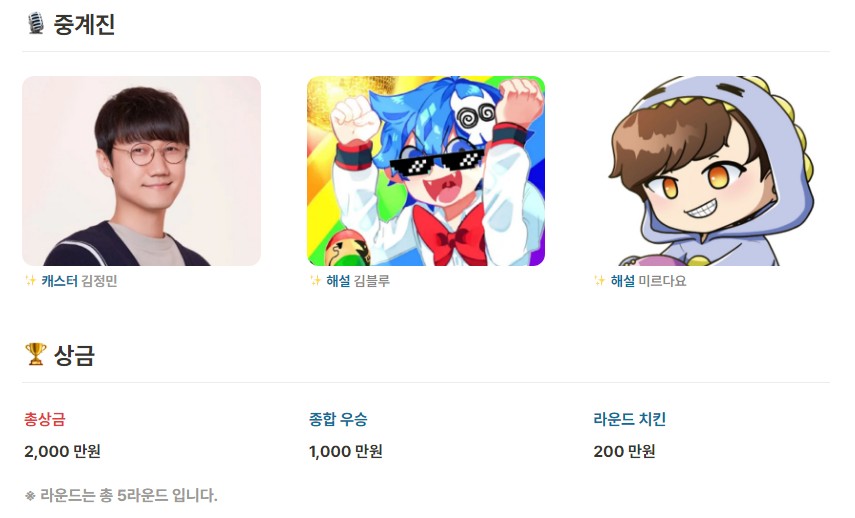 총 상금 2천만 원의 규모에 맞게 유명한 스트리머들이 대거 참가하였습니다. 물론 해설진 역시 유명한 분들로 섭외되었으며, 여기서 콘텐츠 제작 기획에 대한 내용을 참고 하시면 됩니다.