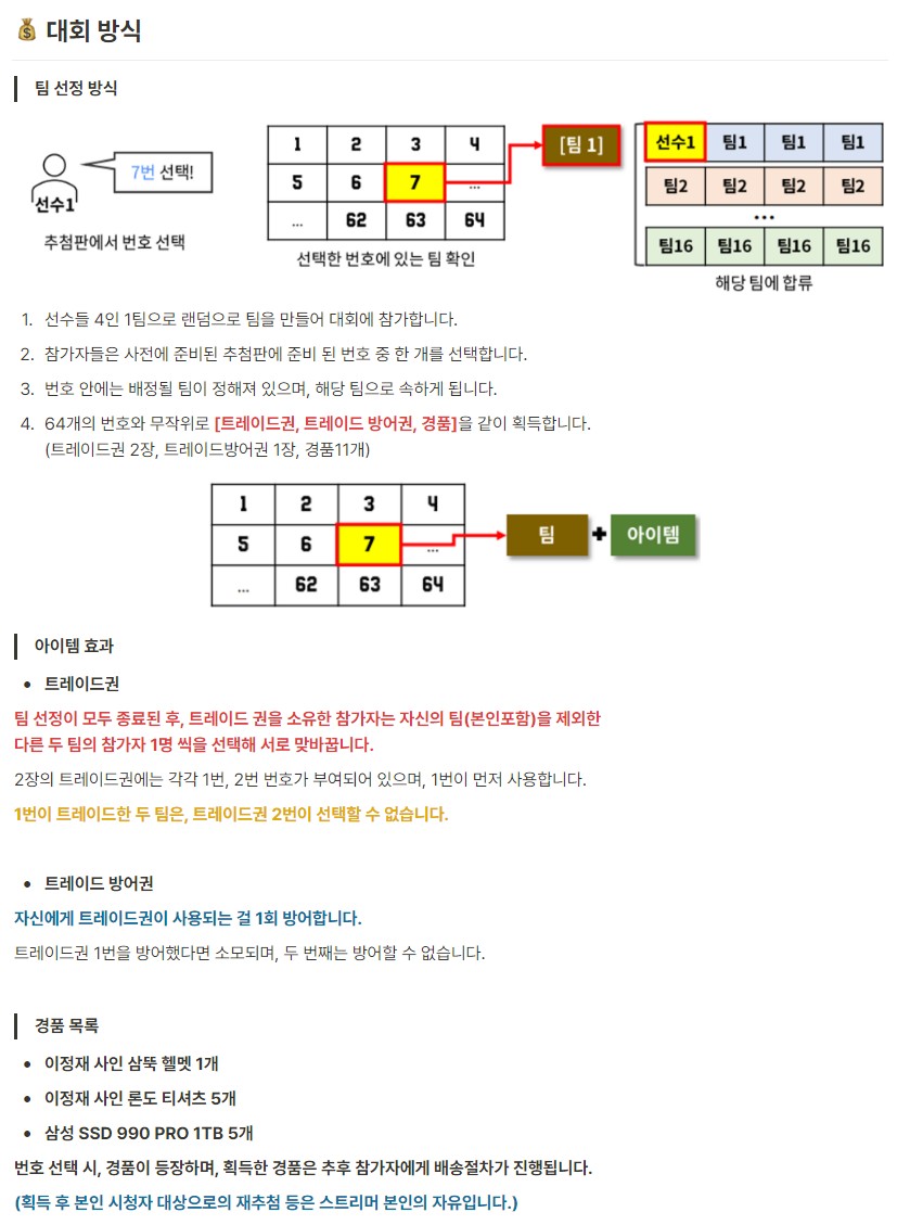 4. 팀 구성은 3인 1팀으로, 팀장은 스트리머 + 2명의 시청자와 함께 총 20팀, 최대 60명의 팀 구성을 이룬다. (팀원은 스트리머여도 상관 없으며, 후보선수 +1명 까지 사전 명단을 제출할 수 있다.)